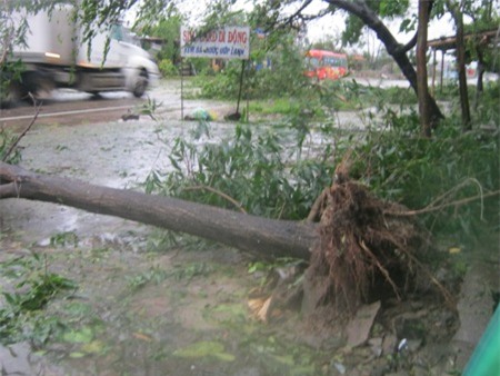 Cây cổ thụ bật gốc do bão, nằm chắn ngang QL 1A qua thị trấn Lăng Cô, huyện Phú Lộc.