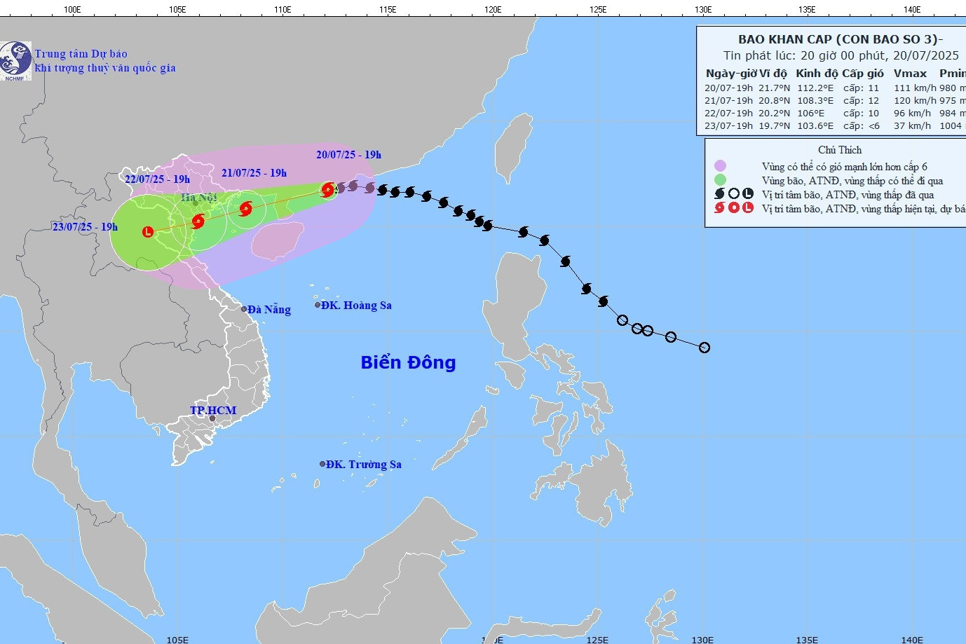 Bản đồ dự báo quỹ đạo và cường độ bão số 3. (Nguồn: NCHMF)