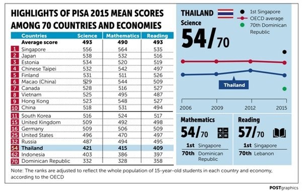 Kết quả Chương trình đánh giá sinh viên quốc tế 2015 (PISA 2015) được công bố gần đây cho thấy điểm số của sinh viên Thái Lan sụt giảm trong khi Singapore vượt qua Trung Quốc, vươn lên đứng thứ nhất trong 70 nước thuộc danh sách phân tích.
