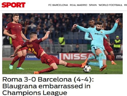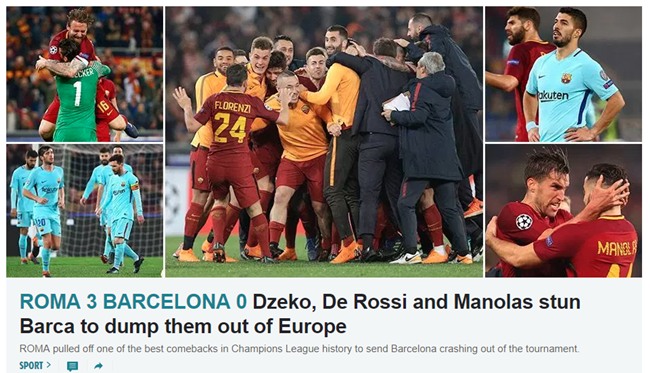 Tờ The Sun đưa tin khá đơn giản với dòng tiêu đề: "Choáng khi Dzeko, De Rossi và Manolas đá Barca khỏi Cup châu Âu." The Sun cũng khẳng định đây sẽ là một trong những màn lội ngược dòng kỳ vĩ nhất lịch sử Champions League.