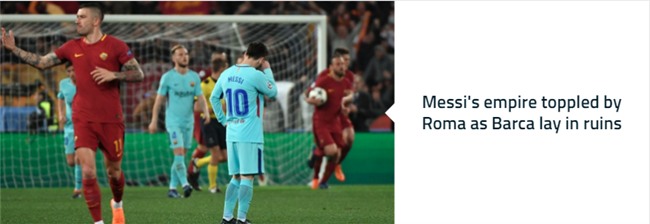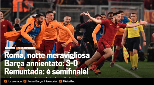 Chứng kiến những cầu thủ AS Roma ăn mừng như thể lên ngôi vô địch, trong khi đó Messi cùng các đồng đội Barca cúi đầu rời cuộc chơi, những tờ báo uy tín của châu Âu cũng sốc nặng. Trong lịch sử Champions League, đây là một trong những cuộc lội ngược dòng sẽ còn được nhắc đến rất nhiều.