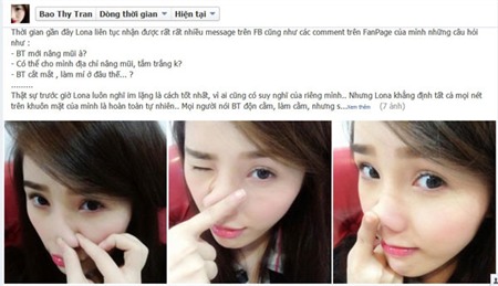 Bảo Thy còn nhấn mạnh: “Lona có chụp vài ảnh từ fone và up ngay lên đây, nếu là mũi sữa thì sẽ không bao giờ có thể lắc và bẻ đủ kiểu như vậy được! Lona nghĩ những bức ảnh này đủ để tất cả các bạn hiểu đây là mũi tự nhiên hay không nhé...Hy vọng những bạn luôn thắc mắc và đồn đoán những vấn đề sai sự thật nên có cái nhìn đúng và chính xác nhất...Cám ơn tất cả”.