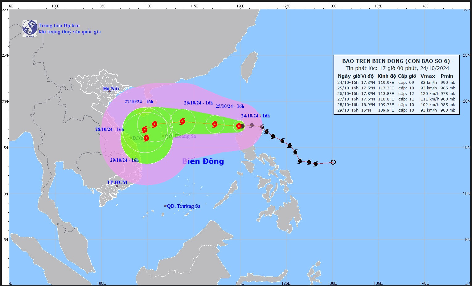 Dự báo hướng di chuyển của bão số 6. Ảnh: Trung tâm Dự báo khí tượng thủy văn quốc gia