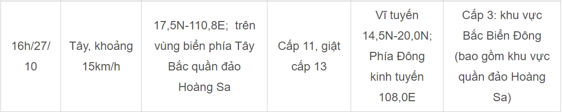 Theo Trung tâm Dự báo khí tượng thủy văn quốc gia, hồi 16h hôm nay, vị trí tâm ở vào khoảng 17,3 độ Vĩ Bắc; 119,9 độ Kinh Đông, trên vùng biển phía Đông của khu vực Bắc Biển Đông. Sức gió mạnh nhất vùng gần tâm bão mạnh cấp 9 (75-88km/h), giật cấp 11. Di chuyển theo hướng Tây, tốc độ 15-20km/h.