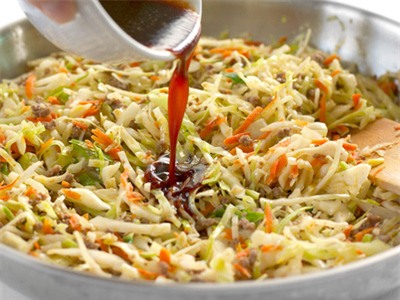 ![]() | ![]() Cho phần nước sốt xào đã chuẩn bị vào chảo thịt bò xào bắp cải đảo chung cho thấm gia vị. |