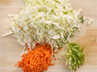 ![]() | ![]() Bắp cải thái sợi nhỏ, cà rốt bào sợ ngắn, hành lá thái nhỏ. |