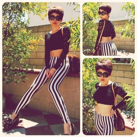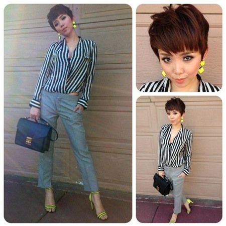 Crop-top đen phối đen-trắng đúng điệu cùng quần kẻ sọc.