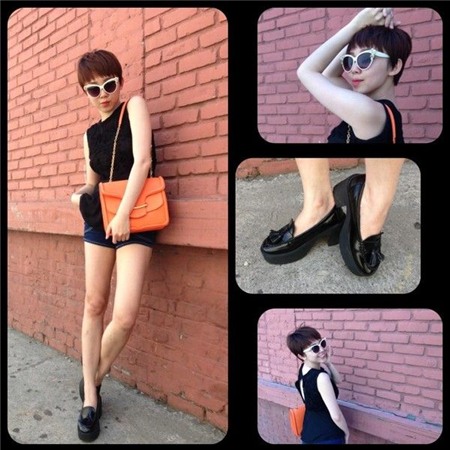 Hay "điệu hóa" phong cách menswear với sơmi trắng buộc nơ, phối theo kiểu "không quần" cùng shorts denim và cũng đôi ankle-strap đó. Điểm nhấn hoàn hảo của trang phục chính là đôi legging họa tiết hoa quá đỗi lạ mắt của cô nàng.