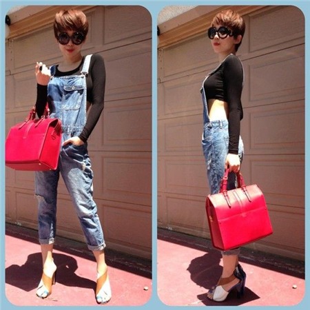 Tóc Tiên mix hiệu quả với cả quần short ton-sur-ton và túi xách đỏ nổi bật lẫn quần skinny cùng phụ kiện màu đen thời thượng.