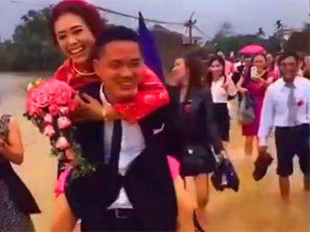 Chú rể không ngại ngần cõng cô dâu vượt qua đoạn đường ngập nước.
