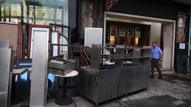 Những đồ đạc của nhà hàng cũng đã được đưa ra bên ngoài, chuẩn bị cho lên xe tải chuyển đi