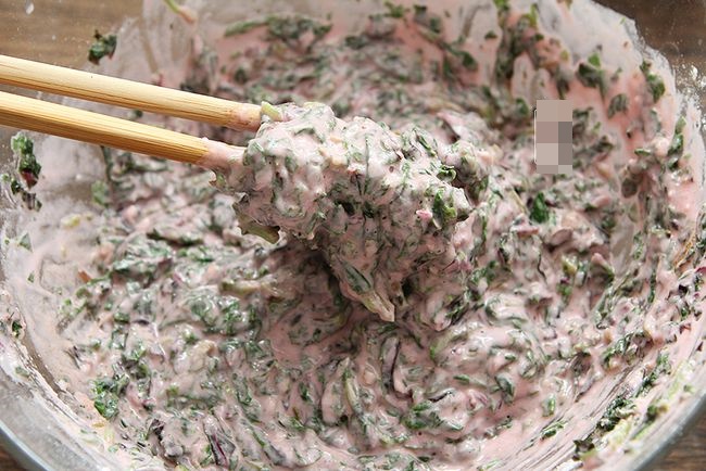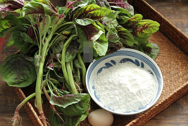 Nguyên liệu: Rau dền lượng thích hợp, bột năng thích hợp, 1 quả trứng, muối lượng thích hợp, một ít bột ngũ vị hương.