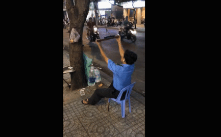 Đây là đoạn clip được ghi lại đường trên đường Lê Văn Sỹ (Quận 3, Tp. Hồ Chí Minh). Trong clip, một người bảo vệ đang tranh thủ chút thời gian nghỉ để luyện tập thể thao.