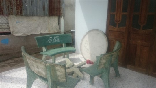 Bộ bàn đá nơi nhóm nhậu ngồi cũng bị hư hại nặng sau khi án mạng xảy ra. |