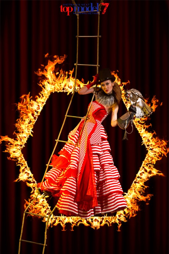Trong thử thách chụp với vòng lửa, các thí sinh được photoshop quá giả. Với khoảng cách như trong ảnh, hẳn người trong vòng lửa đã bị cháy xém chứ không thể hiên ngang tạo dáng thế này.