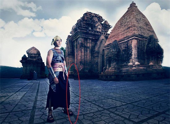 Khoảng trống tam giác ở tay trái Huyền Trang không liên quan đến khung cảnh xung quanh đang có nắng và biển