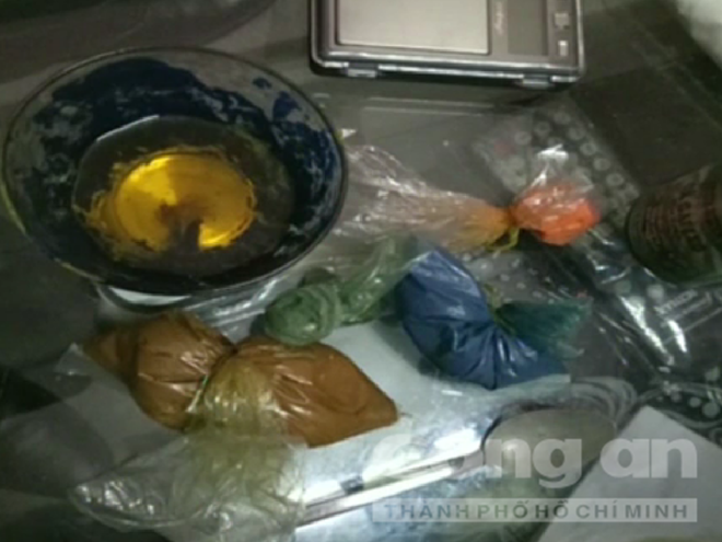 Giữa căn phòng nồng nặc mùi khói, một vài dụng cụ sử dụng ma túy vẫn còn nguyên chưa kịp phi tang. Cạnh đó còn có 5 viên nén và 1 gói chất bột màu trắng.