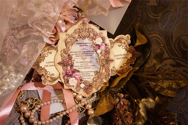 Mới đây, Lương Thế Thành và Thúy Diễm đã hé lộ thiệp cưới được thiết kế vô cùng tỉ mỉ và công phu. Thiệp cưới của cặp đôi này lấy tông hồng, trắng và đồng làm màu chủ đạo. Nó đượm chất cổ tích với kiểu dáng mô phỏng những chiếc gương soi của giới quý tộc Châu Âu. Điểm xuýt cho tấm thiệp thêm mềm mại, kiêu sa là những dây ruy băng hồng được cột thật điệu đà phía ngoài.