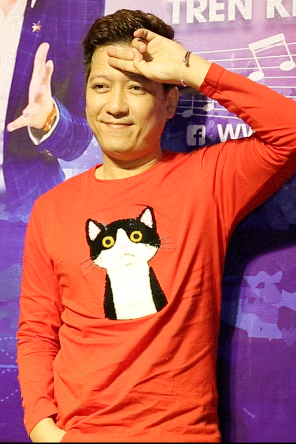 Trường Giang đến đúng giờ. Nam danh hài bình thường hay diện áo sơ mi đơn giản nhưng hôm nay lại nổi bật với cả cây màu nổi trẻ trung. Chia sẻ về việc thay đổi hình ảnh quá bất ngờ, danh hài Mười Khó cho biết đây là đồ quay một chương trình mới, không kịp về nhà thay nên mặc luôn qua họp báo.