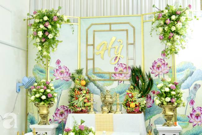 Nơi làm lễ và gặp mặt hai gia đình được trang trí theo phong cách truyền thống đan xen hiện đại đầy tinh tế.