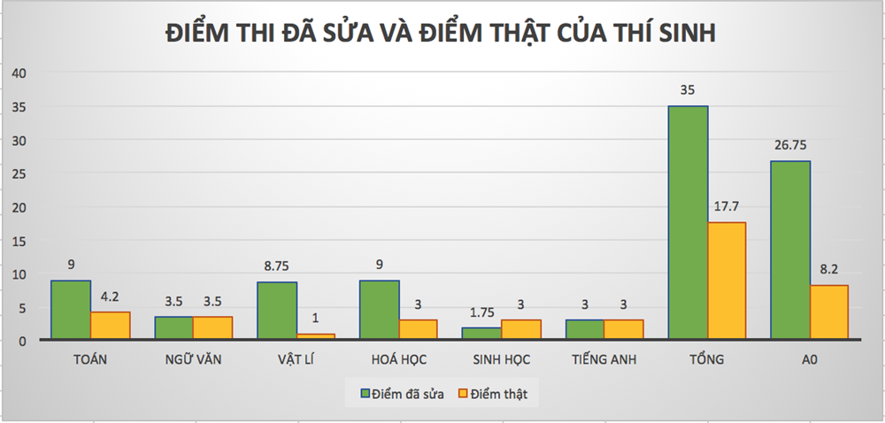 Đó là thí sinh có số báo danh 050000xx. Ở 6 môn thi, thí sinh này chỉ đạt điểm thực là 17,7 điểm. Sau đó, đã được "phù phép"để có tổng 35 điểm.