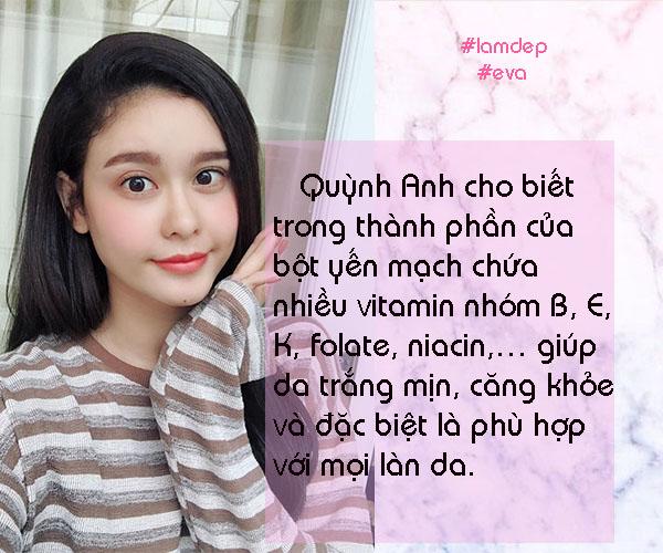 Trương Quỳnh Anh cũng là một trong số mỹ nhân Việt sở hữu làn da đẹp khiến nhiều người ganh tị. Người đẹp sử dụng bột yến mạch để làm công thức chăm sóc da mặt trắng mịn.
