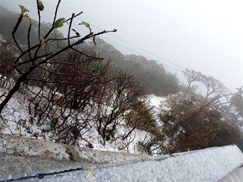 Mưa băng phủ kín quanh những bụi cây. Theo dự báo từ Trung tâm khí tượng thủy văn, từ ngày 2/2, khu vực Bắc Bộ đón không khí lạnh tăng cường. Do ảnh hưởng của khối không khí lạnh bổ sung, thời tiết trên đỉnh Fansipan rét đậm, kèm theo sương mù.