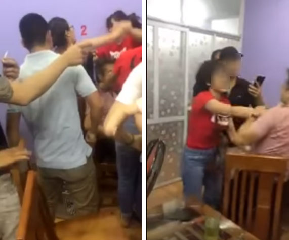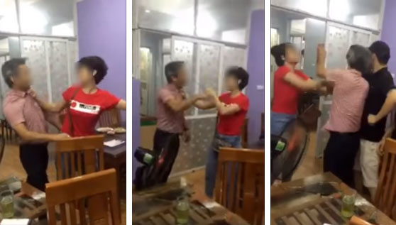 Theo đó, hình ảnh trong đoạn clip ngắn ghi lại cho thấy, ngay khi xông vào chứng kiến sự việc, những người đi cùng chị vợ (tóc ngắn, áo đỏ, đeo kính) đã xông vào túm áo cô nhân tình đồng thời phá hỏng bữa ăn. Riêng chị vợ túm cổ áo chồng chửi bới và chì chiết thậm tệ: "Chúng mày phè phỡn thế này đây à?".