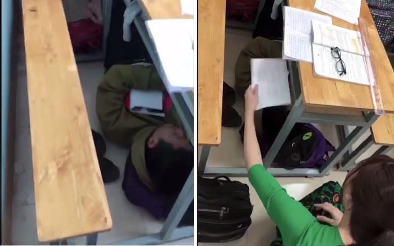 Theo đó, đang trong giờ học nhưng cậu học sinh lại chẳng hề theo dõi bài giảng. Không chỉ vậy còn cả gan chui xuống gầm bàn nằm ngủ như chốn không người.