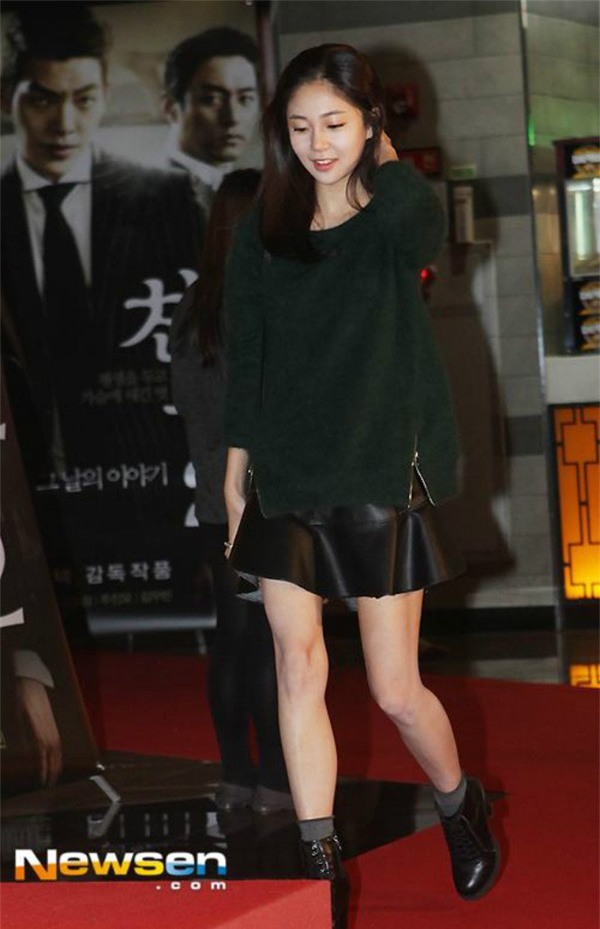 Beak Jin Hee lựa chọn set đồ cá tính với áo len xẻ vạt trùm ngoài chân váy da.