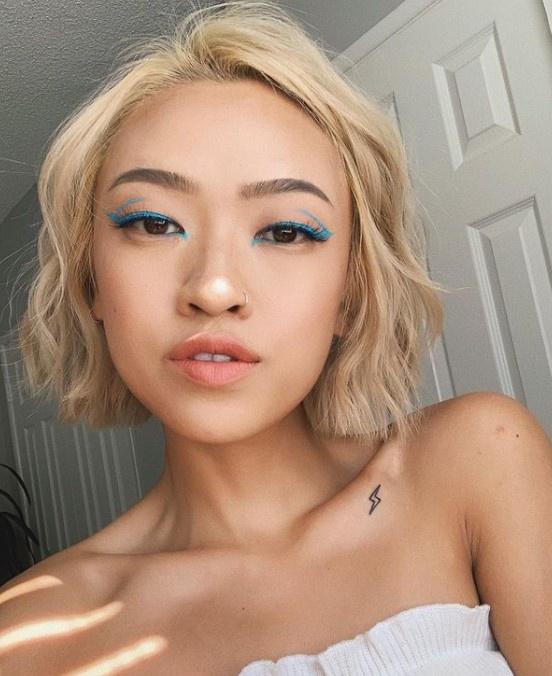 Eyeliner màu xanh biển khiến cho dáng mắt mèo truyền thống trở nên ấn tượng hơn. Khi kết hợp thêm các dáng graphic liner sẽ mang đến diện mạo phá cách và mới mẻ.