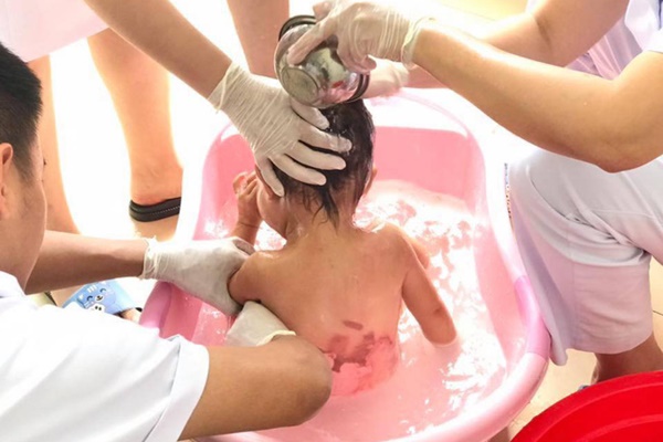 Bé Minh Minh nhập viện trong tình trạng có 2 vết bỏng ở cằm và ngực. Bác sĩ Lưu - Giám đốc Khoa Bỏng và Phẫu thuật thẩm mỹ Bệnh viện Nhi đồng Phúc Châu (trực thuộc Đại học Y Phúc Kiến) cho biết em bé nhập viện trong tình trạng thở gấp, da toàn thân rất đỏ, môi hơi tím. Diện tích bỏng không lớn nhưng tại sao tình trạng của cậu bé khá nghiêm trọng?