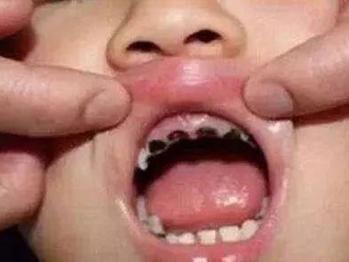 Sau gần 3 tháng, mẹ Huy Huy mới phát hiện răng của bé bị ăn mòn xuất hiện những vết ố đen như bị sâu. Lo lắng về vấn đề răng miệng của con, chị đưa bé tới bệnh viện kiểm tra, tại đây bác sĩ cho biết bé bị sâu răng. Nguyên nhân chính là do ngậm núm vú giả trong suốt thời gian dài.