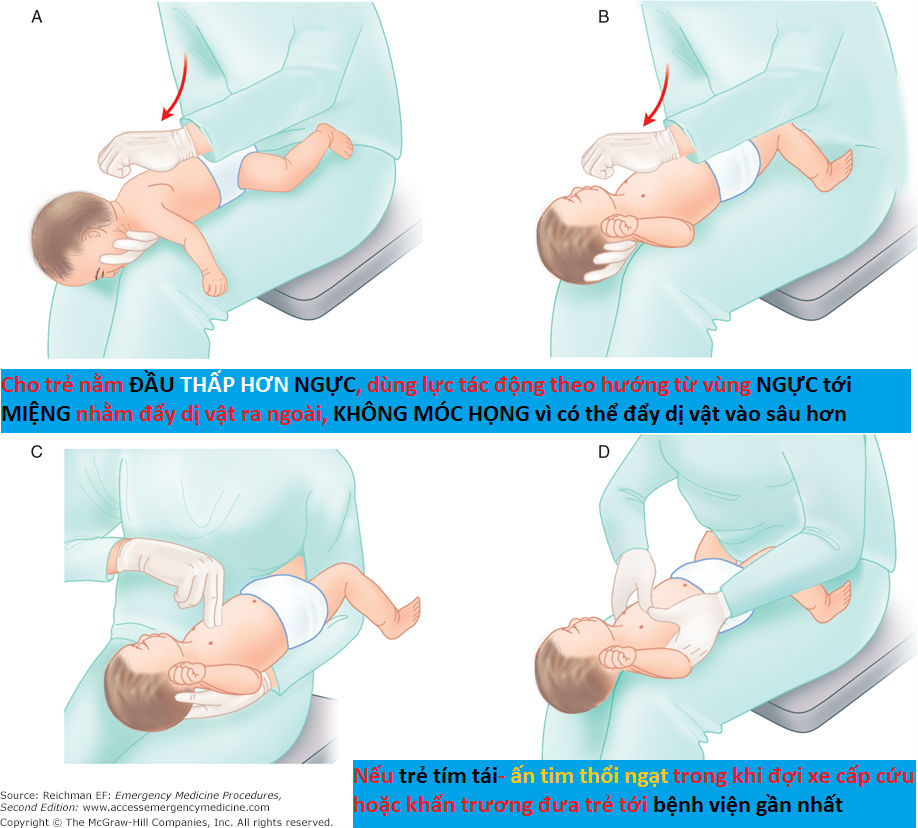 Trường hợp trẻ bị hóc dị vật, bố mẹ hãy sơ cứu (theo hình bên trên) và nhanh chóng đưa trẻ tới cơ sở y tế cấp cứu - bác sĩ khuyến cáo.