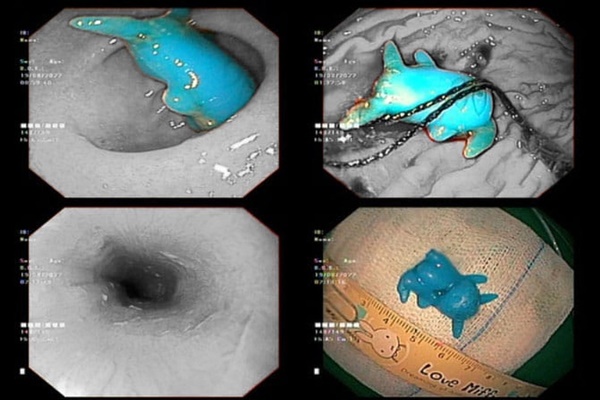 Qua thăm khám, dị vật được phát hiện kẹt ở 1/3 giữa thực quản. Hình thù đồ chơi có sừng dài dễ đâm thủng thực quản và gây khó khăn trong quá trình xử trí.