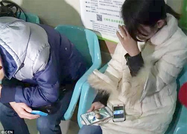 Mẹ của Kang Kang ngồi chờ bên ngoài phòng bệnh
