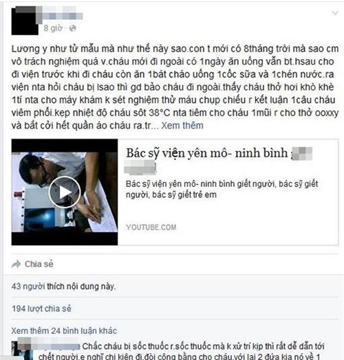 Người mẹ trẻ đau đớn và bức xúc viết: “Lương y như tử mẫu mà như thế này sao? Con tôi mới có 8 tháng trời mà sao lại vô trách nghiệm quá vậy? Cháu mới đi ngoài có 1 ngày, ăn uống vẫn bình thường, hôm sau cho đi viện, trước khi đi cháu còn ăn 1 bát cháo, uống 1 cốc sữa và 1 chén nước.