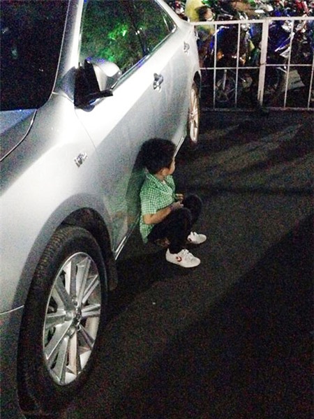 | Ngồi bệt xuống cạnh xe đợi ba mẹ. |