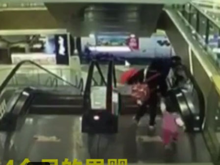vào thang cuốn, được người bà bế lên kịp thời.