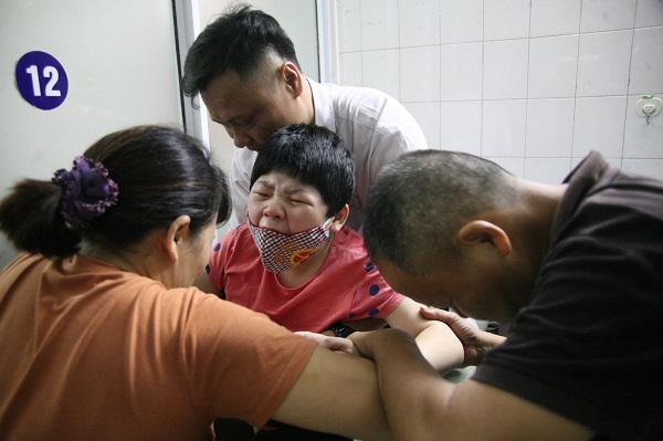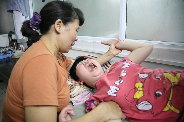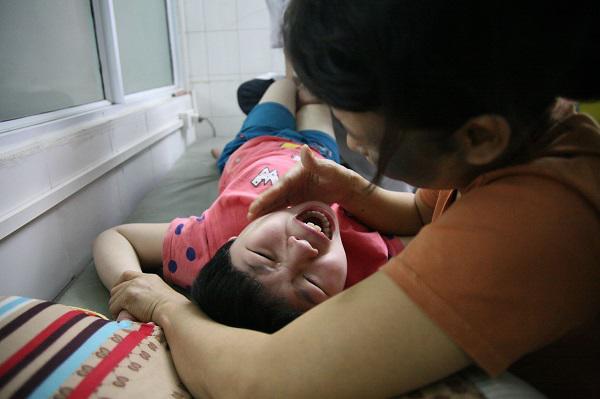 Ngồi trong phòng điều trị tại Bệnh viện Nam Thăng Long, mỗi khi bác sĩ vật lý trị liệu thực hiện các thao tác cho con mình, chị Hằng giúp bác sĩ gì chặt tay con xuống giường. Còn chồng chị cố gắng giữ chặt đầu, dùng khẩu trang bịt miệng để con không cắn vào lưỡi.
