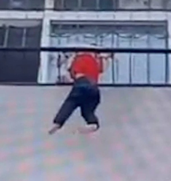 Bé gái bị mắc kẹt nửa người treo “tòn ten” trên không trung. Có lẽ vừa hoảng loạn vừa khó chịu nên bé không ngừng đung đưa thân người. Cảnh tượng khiến người chứng kiến phải kinh hoàng, nếu bé vùng vẫy mạnh thì chắc chắn sẽ lọt qua khung sắt rồi rơi xuống mất mạng. Nhiều người đứng phía dưới nhất thời không biết làm gì, chỉ biết không ngừng gọi to: “Đừng động đậy! Nằm im!”.