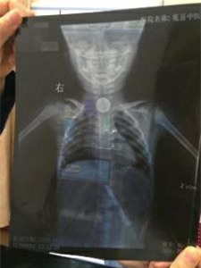 Sau đó chị Trương ra hiệu thuốc mua thuốc bôi trơn về cho bé, nhưng họ vẫn không lấy được xu ra mà còn khiến bé gái nôn thốc nôn tháo. Lúc này, người nhà mới vội vàng đưa Nghiên Nghiên đến bệnh viện, phim chụp cho thấy đồng xu vẫn kẹt trong cổ họng, tình trạng vô cùng nguy hiểm, phải lập tức đưa lên bệnh viện tuyến trên.