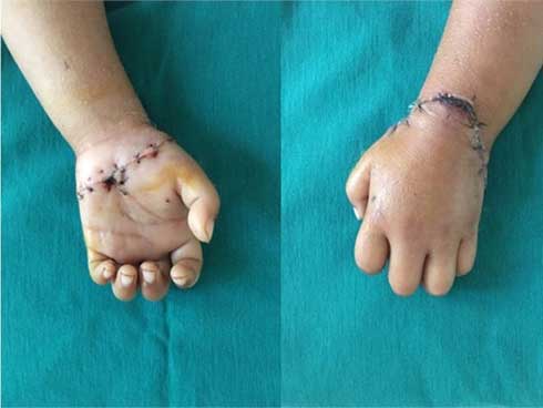 Sau 3,5 giờ phẫu thuật, kíp mổ đã trồng lại thành công bàn tay cho bệnh nhân nhi mới 31 tháng tuổi này. Sau mổ bệnh nhân được chăm sóc hậu phẫu tốt, được xuất viện sau 12 ngày điều trị.