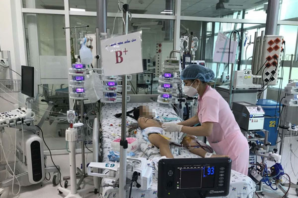 "Khi đến bệnh viện, bé đã thở máy, người tím tái, mạch nhẹ, tim lờ đờ, men tim và men gan tăng cao. Tình trạng trẻ diễn tiến nặng, sốc không cải thiện", bác sĩ Tiến nhận định.