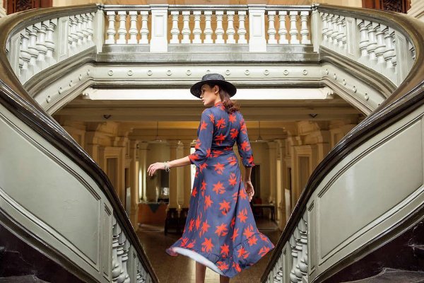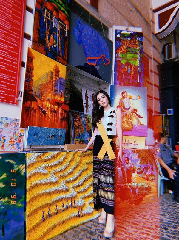 Á hậu Bùi Phương Nga diện trang phục dân tộc của phụ nữ Myanmar và chụp hình tại phòng tranh.