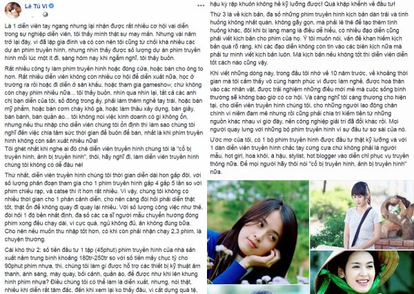 Nữ diễn viên Lê Tú Vi tâm sự đôi điều về những khó khăn để cho ra một bộ phim truyền hình chất lượng. Bên cạnh đó, cô cũng bày tỏ nỗi buồn khi đồng nghiệp phải bỏ nghề diễn để tham gia gameshow hoặc diễn trên sân khấu. Cô hy vọng trong một tương lai không xa, ngành điện ảnh của Việt Nam sẽ phát triển hơn nữa để sản xuất ra các tác phẩm truyền hình thật chỉn chu.