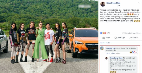 Sau khi xem xong Asia Next Top Model với sự góp mặt của Hồ Ngọc Hà trong vai trò khách mời, Châu Đăng Khoa bày tỏ sự ngưỡng mộ với nữ ca sĩ và đòi người đẹp mua tặng cho xế khủng.