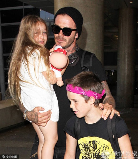 Giới săn ảnh vừa ghi lại được những hình ảnh của David Beckham cùng con trai Cruz và bé Harper rời sân bay Los Angeles ngày 11/7. Trong những khoảnh khắc mới nhất, "công chúa" út nhà Becks xõa tóc dài, diện váy trắng. Bé ôm búp bê và được bố bế trên tay.
