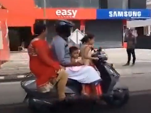 Bé gái thản nhiên đứng trên xe ga và cầm lái phóng xe lao vun vút, trong khi bố mẹ em ngồi đằng sau với vẻ mặt vui vẻ...