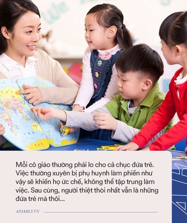 Mỗi cô giáo thường phải lo cho cả chục đứa trẻ. Việc thường xuyên bị phụ huynh làm phiền như vậy sẽ khiến họ ức chế, không thể tập trung làm việc. Sau cùng, người thiệt thòi nhất vẫn là những đứa trẻ mà thôi...